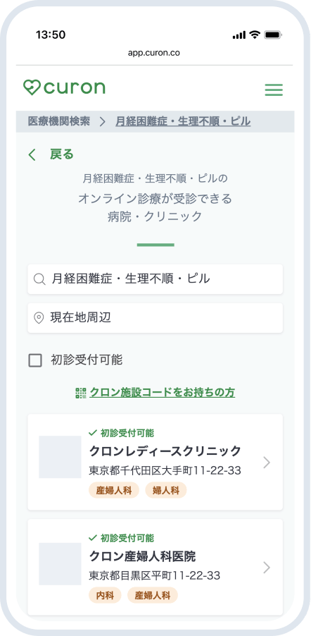 クロンを導入いただいている医療機関でのみ受診することができます。クロンを導入している医療機関一覧は、
