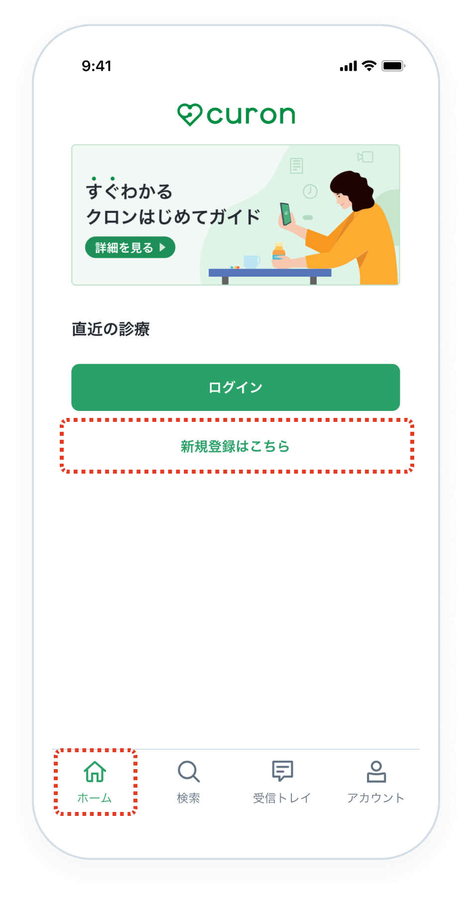 アプリの「ホーム」画面の「新規登録はこちら」を選択します。