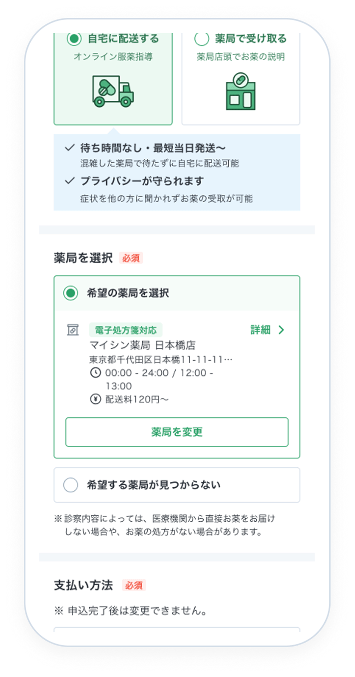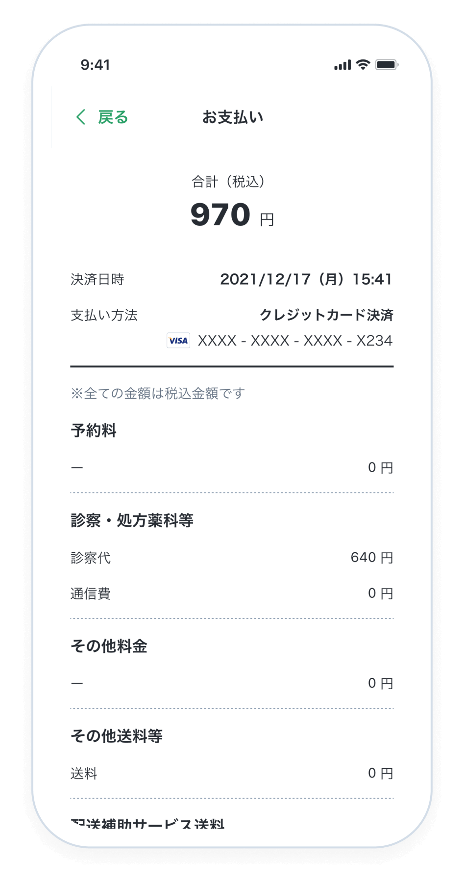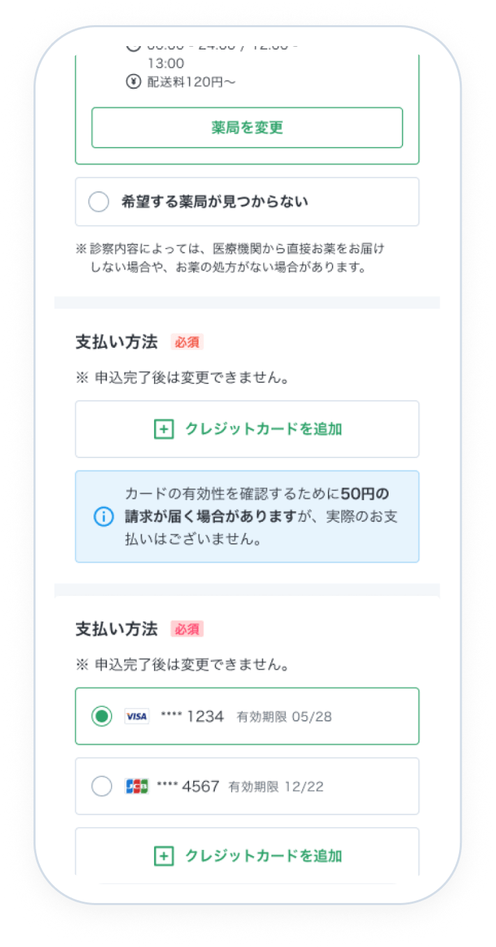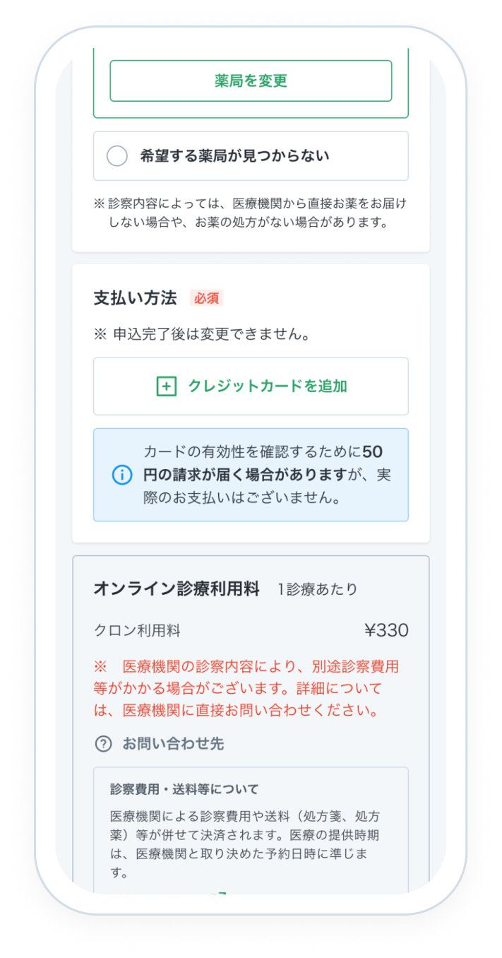 診療代金やお薬・処方箋の配送料などのお支払いはクレジットカード(VISA, MasterCard, JCB, AMEX, Diners)で決済いただけます。