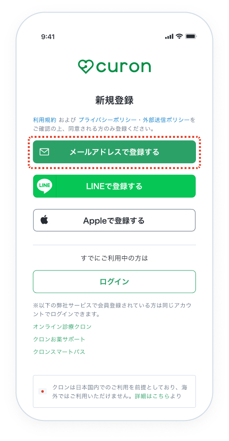 メールアドレスとパスワードで登録される方は「メールアドレスで登録する」を選択します。
