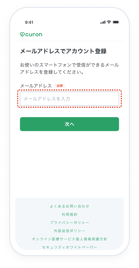 お使いのメールアドレスを入力し、「次へ」を押します。