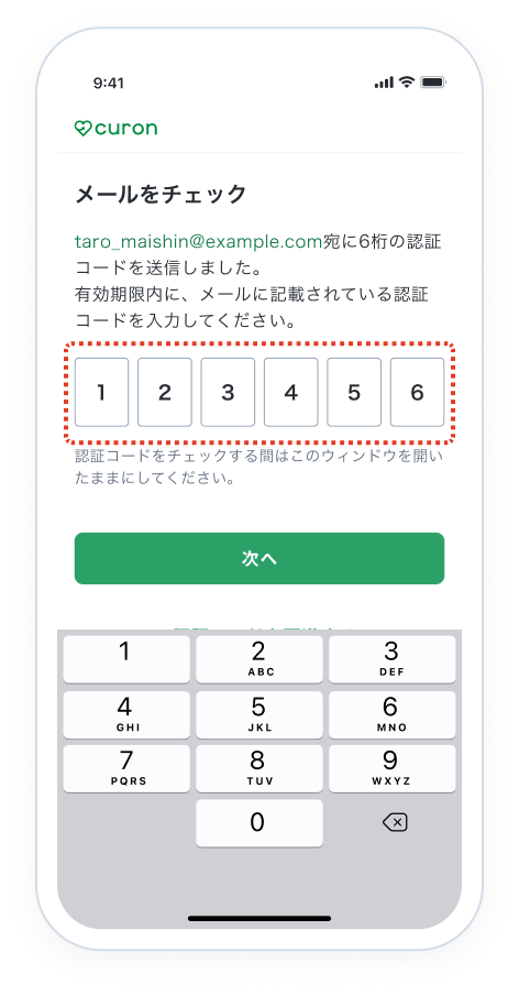 登録したメールアドレスに6桁の認証コードをお知らせするメールが届きます。メールに記載してある数字を登録画面に入力して、「次へ」を押します。