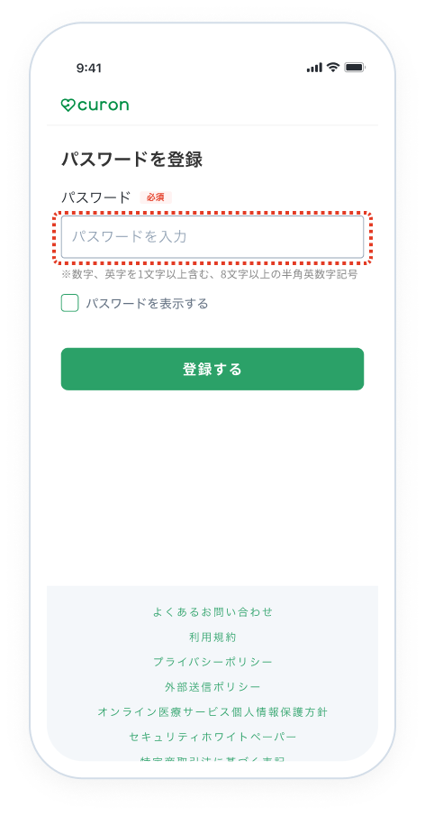 ご自身で決めたパスワードを入力します。パスワードを数字と英字を1文字以上含む、8文字以上の半角英数字記号で入力し、「登録する」を押します。